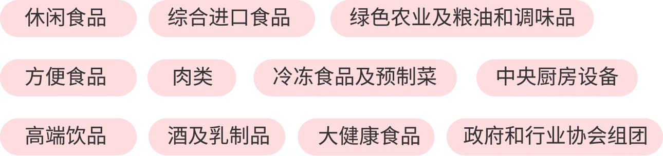 | 食品半成品、配料及原輔料,乳制品及蛋類,新鮮肉類,新鮮禽肉,新鮮水產(chǎn)品及半成品,果蔬及干果,觀賞型農(nóng)產(chǎn)品及種子、幼苗,零食、糖果、巧克力及烘焙類食品,腌制肉類,熟食及方便類食品,罐藏食品,寵物食品,冷凍食品,有機(jī)食品,大健康食品及兒童食品,糧油及調(diào)味品食品綜合,葡萄酒及烈酒其他酒精飲料,非酒精飲料,供應(yīng)鏈數(shù)字貿(mào)易,餐飲,相關(guān)設(shè)備、技術(shù)及來料加工,相關(guān)服務(wù) |