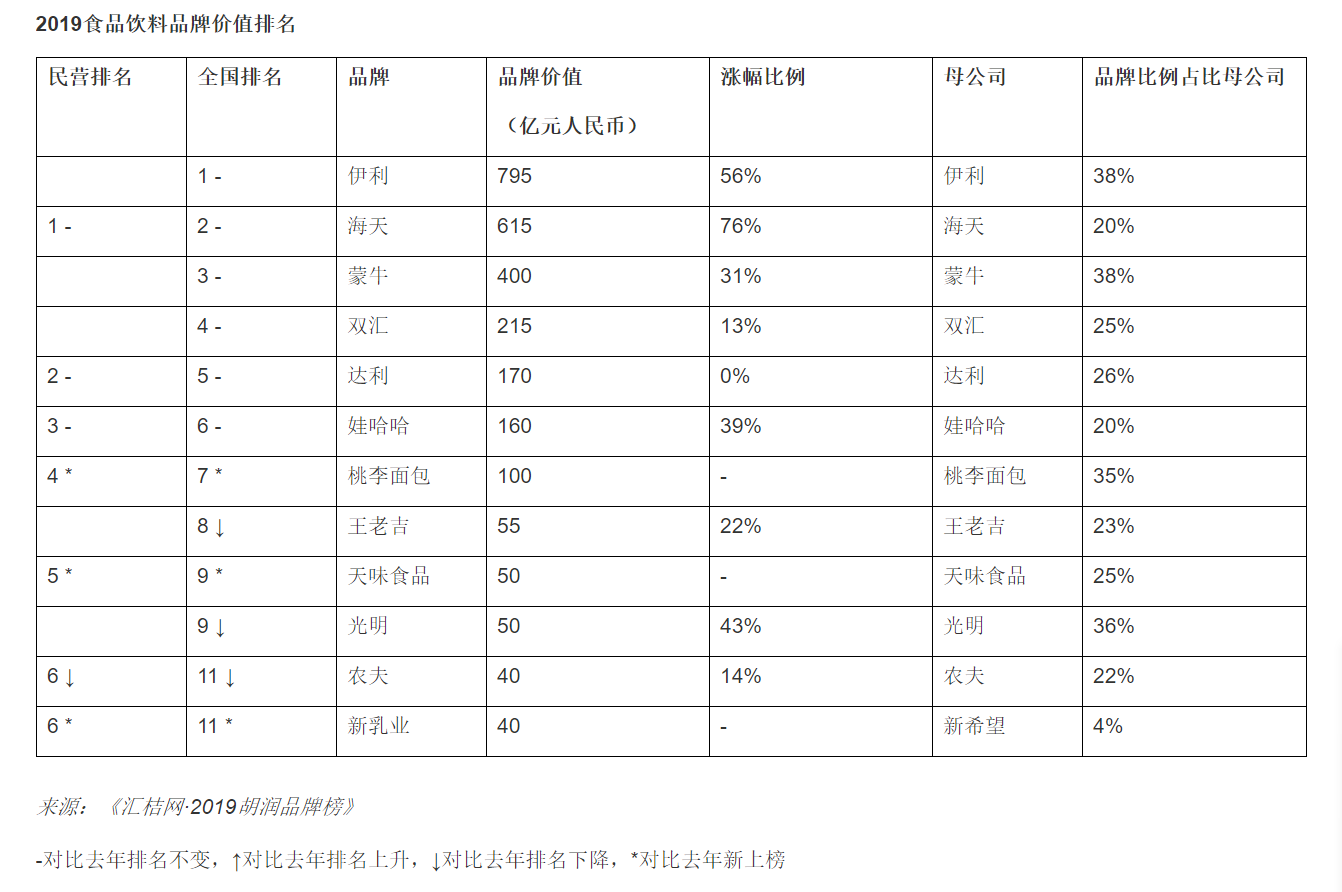 近日,胡潤研究院聯合匯桔網發布《匯桔網·2019胡潤品牌榜》,評出了最具價值的中國本土品牌200強,貴州茅臺以6400億元的品牌價值第二次成為“最具價值中國品牌”。在食品飲料榜單上,伊利蟬聯食品飲料行業冠軍,品牌價值比去年增長56%至795億元。海天與蒙牛仍排第二、第三名。食品飲料行業共有12個品牌上榜(去年為10個),其中7個為民營品牌。食品飲料行業上榜品牌的品牌價值總和占整張榜單的3%。廣東,內蒙古,浙江和四川是食品飲料行業上榜品牌最多的地區,各有2個品牌上榜。
