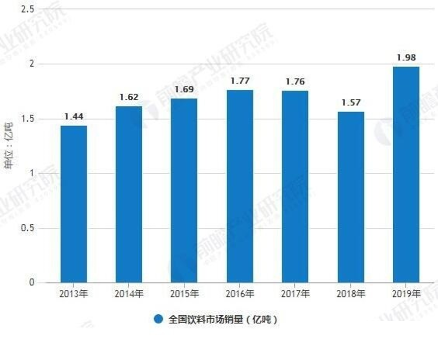 當前,龐大的中國飲料市場依舊保持增長,據前瞻產業研究院發布的《中國軟飲料行業產銷需求與投資預測分析報告》統計數據,截止至2018年底,全國飲料產量為15679.2萬噸,同比增長6.9%。預測2019年中國飲料市場將保持增長,產量將突破2億噸,達到2.03億噸。