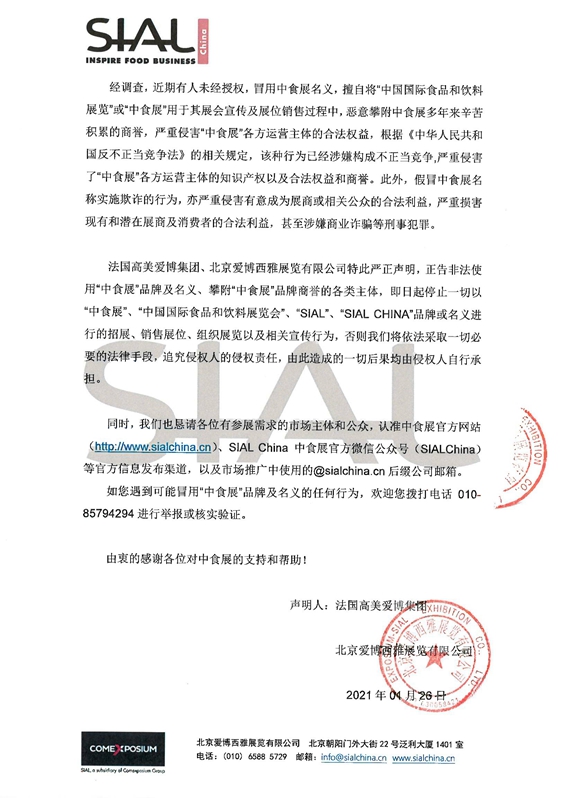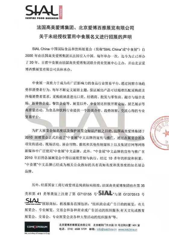 關(guān)于未經(jīng)授權(quán)冒用中食展名義進行招展的聲明 法國高美愛博集團、北京愛博西雅展覽有限公司