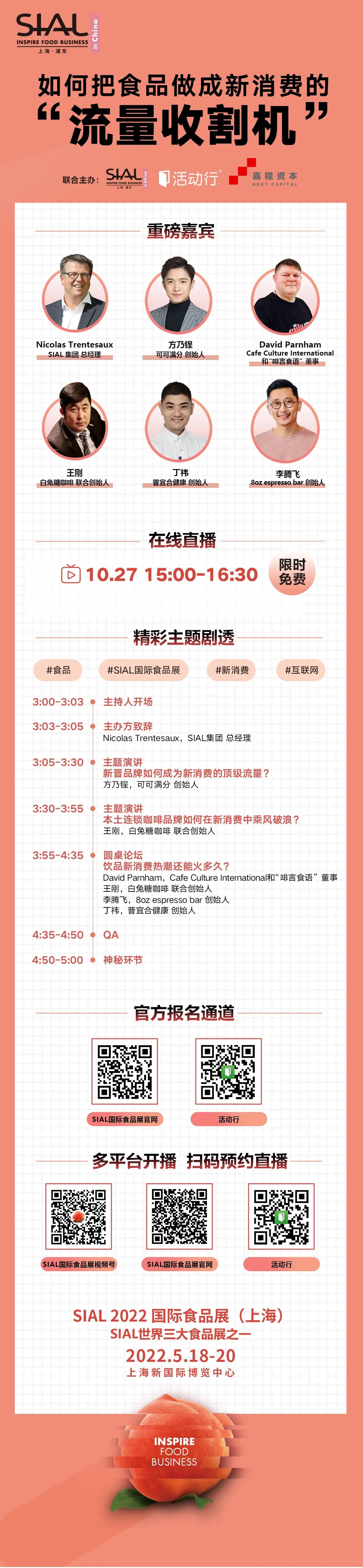 食品新消費千億市值品牌需要新的視野與打法。SIAL自1964年巴黎成立以來一直通過SIAL 在線智庫(SIAL Think Tank)聚集全球最具創(chuàng)新力的食品品牌,為食品行業(yè)帶來前瞻性思考。10月27日(周三)下午3:00-5:00,SIAL在線智庫直播計劃正式開啟,在第一期直播中,來自新消費飲品的新銳品牌高管將分享:如何把食品做成新消費的“流量收割機”
