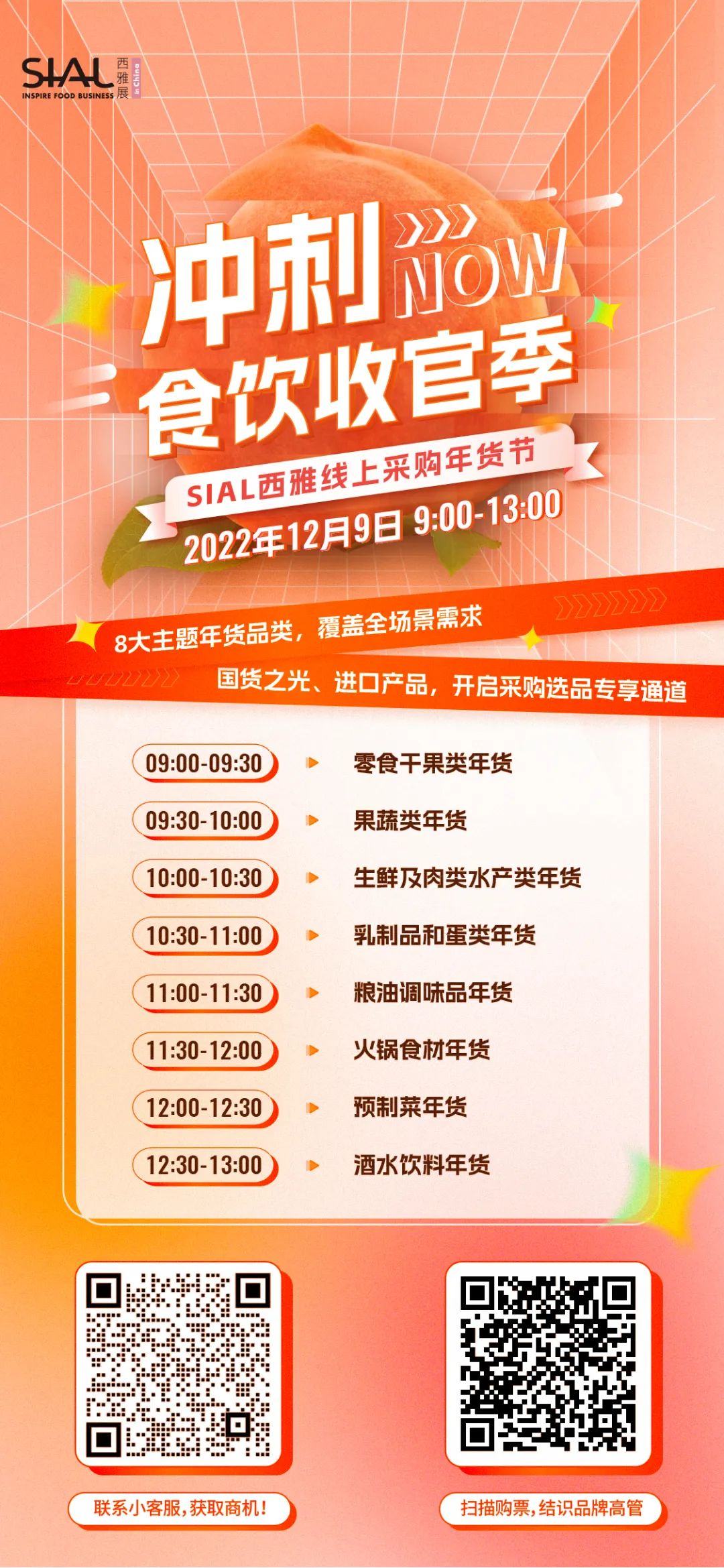 繼為展商和專業(yè)買家舉辦“SIAL西雅線上采購年貨節(jié)”專場活動后,SIAL西雅國際食品展(音譯中文簡稱:西雅展)再度“加碼”年貨節(jié),即將于2022年12月9日推出“SIAL西雅線上采購年貨節(jié)”私域?qū)偻平椋瑸槭筹嬓袠I(yè)供需雙方實現(xiàn)年底完美收官再添助力。