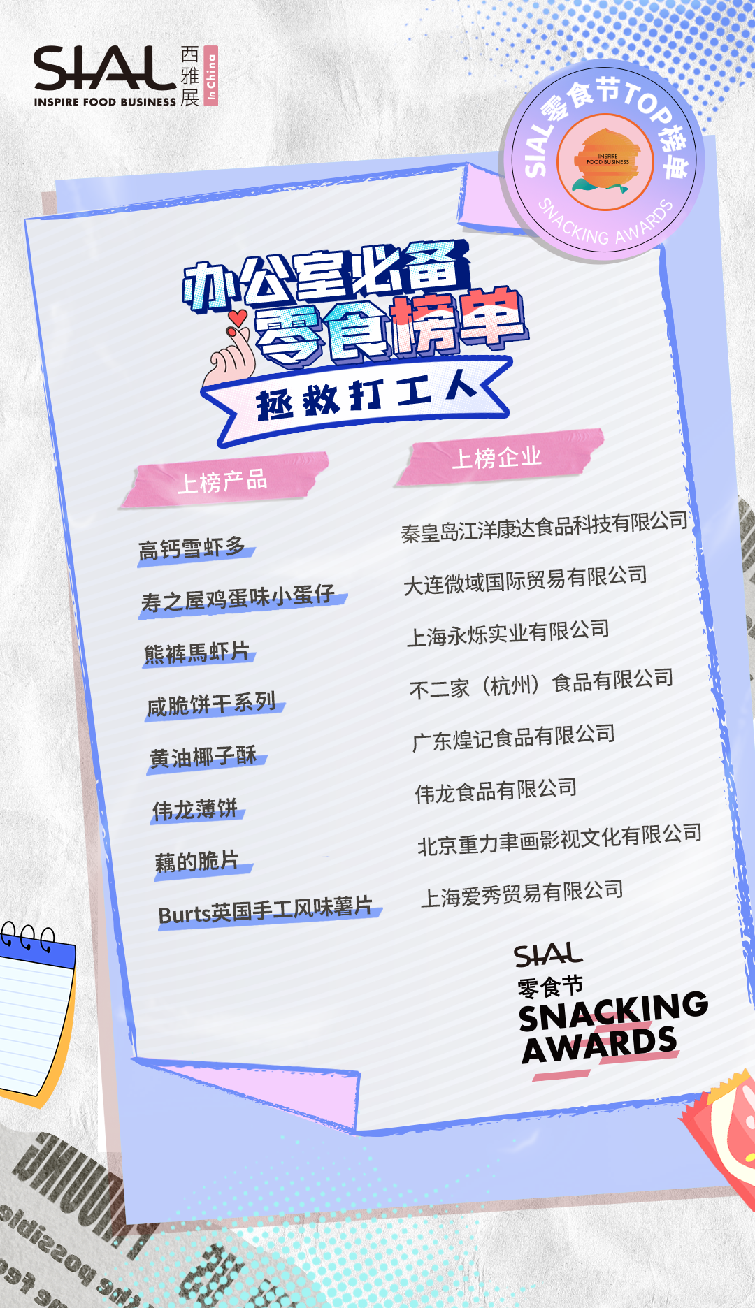 本次活動共計80家企業及產品榮膺SIAL零食節TOP榜單。上榜產品,均由C端消費者、B端專業用戶、頭部KOL、主辦方從“顏值包裝”“口味好評”“時下熱度”“健康低卡”“方便快捷”“創意獵奇”等多維度測評而出。