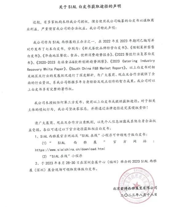 2、于2023年8月28-30日在深圳會展中心(福田)舉辦的2023 SIAL西雅展(深圳)展會現場可領取實體版白皮書。