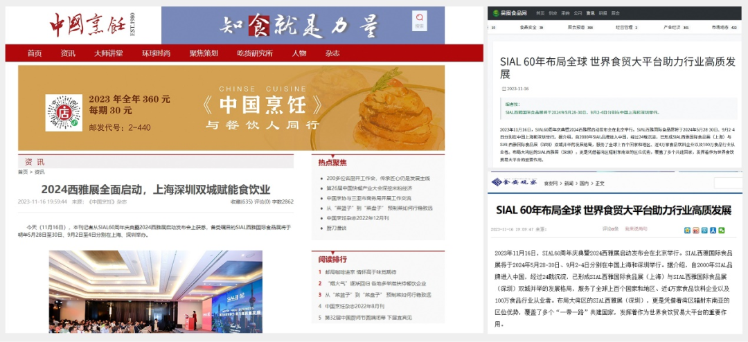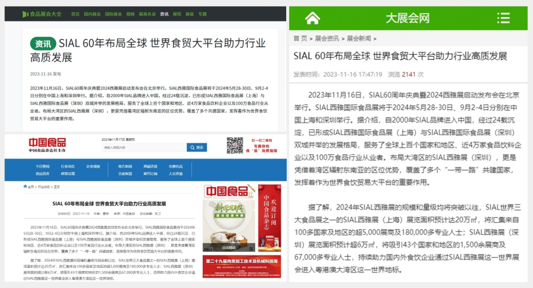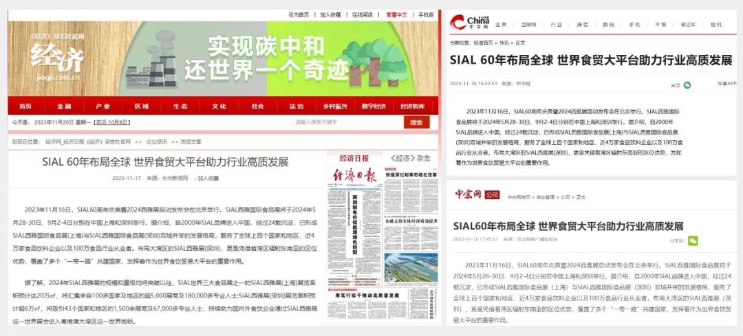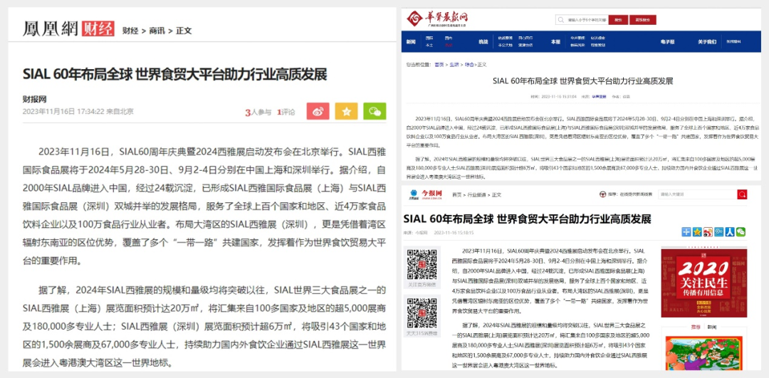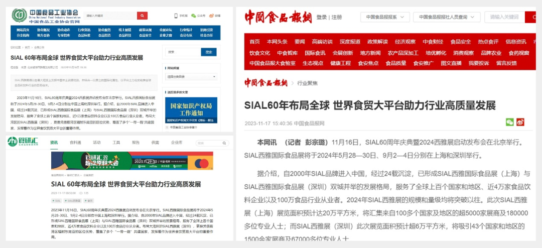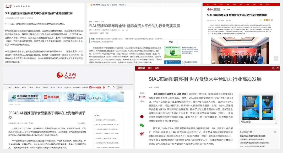 11月16日,SIAL60周年慶典暨2024西雅展啟動發(fā)布會在京舉行。隨后一條題為“SIAL 60年布局全球 世界食貿(mào)大平臺助力行業(yè)高質發(fā)展”的消息迅速被新華網(wǎng)、人民網(wǎng)、環(huán)球網(wǎng)、CHINA DAILY等主流官媒以及一眾行業(yè)媒體競相報道,百余媒體強勢聚焦,SIAL西雅展影響力再破圈。