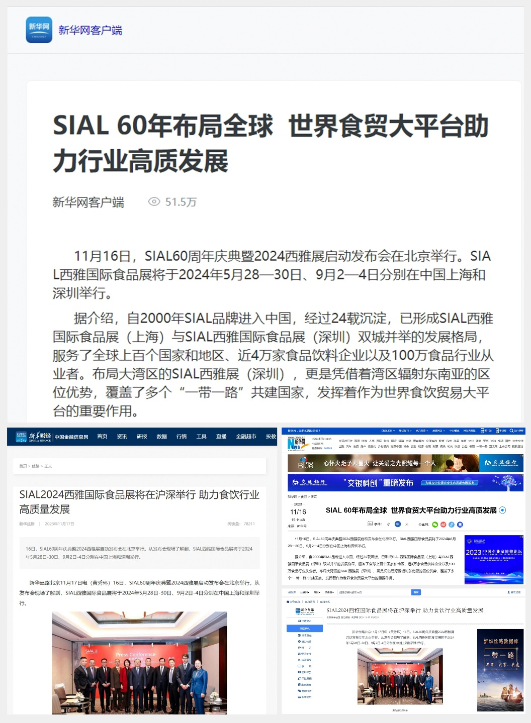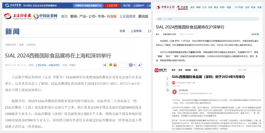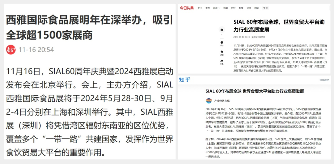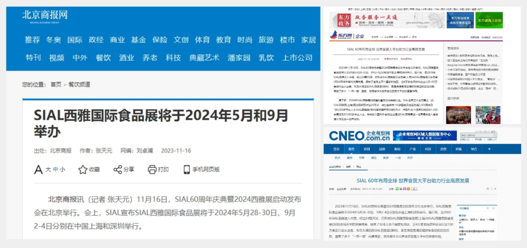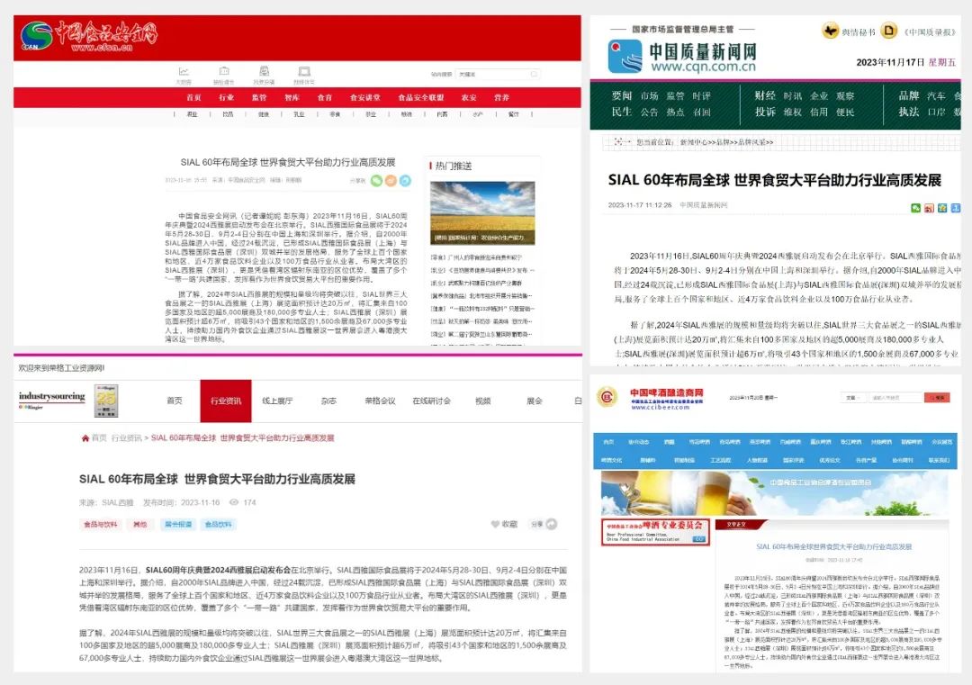 11月16日,SIAL60周年慶典暨2024西雅展啟動發(fā)布會在京舉行。隨后一條題為“SIAL 60年布局全球 世界食貿(mào)大平臺助力行業(yè)高質發(fā)展”的消息迅速被新華網(wǎng)、人民網(wǎng)、環(huán)球網(wǎng)、CHINA DAILY等主流官媒以及一眾行業(yè)媒體競相報道,百余媒體強勢聚焦,SIAL西雅展影響力再破圈。