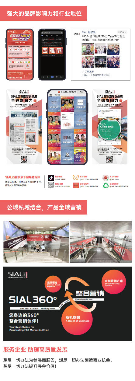 SIAL作為國(guó)際領(lǐng)先的食品飲料大展,不僅擁有強(qiáng)大的品牌影響力、豐富的專業(yè)買(mǎi)家資源,還具備全鏈路、全觸點(diǎn)、全洞察的能力。它以數(shù)據(jù)驅(qū)動(dòng),以消費(fèi)者為中心,全面覆蓋展前、展中、展后,構(gòu)建了一個(gè)智能化營(yíng)銷(xiāo)矩陣,幫助企業(yè)提升品牌知名度、發(fā)掘商機(jī)、促進(jìn)產(chǎn)品流通。