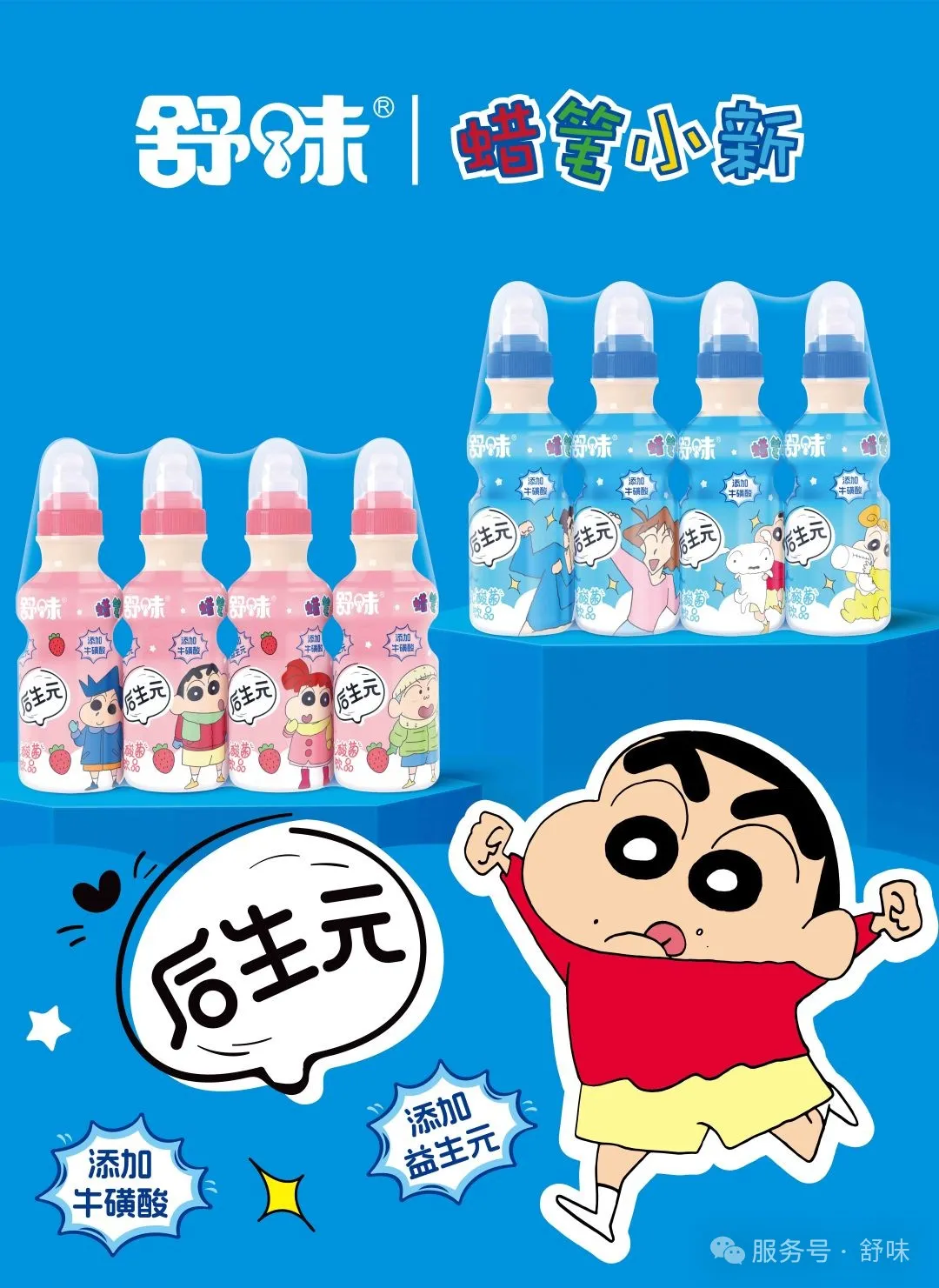 產(chǎn)品亮點(diǎn):聯(lián)合活潑可愛的蠟筆小新形象推出的舒味乳酸菌,添加牛磺酸、益生元,自然發(fā)酵,純正好味,0脂健康,適合朋友小聚時來一瓶。